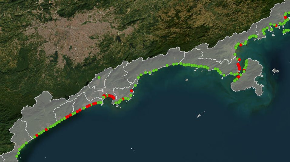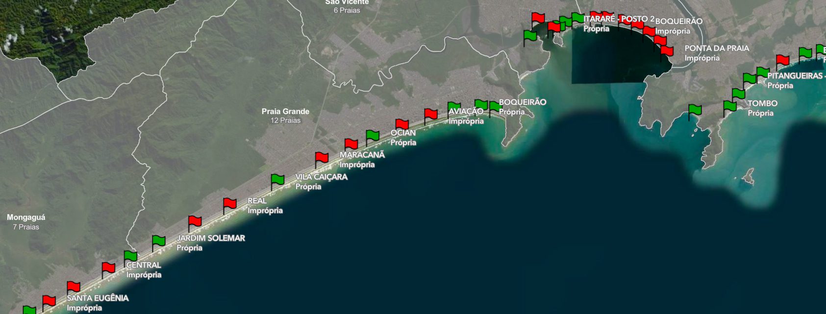 •   Em Santos estão comprometidas as praias Embaré, Ponta da Praia, Aparecida, Boqueirão, Gonzaga e as duas José Menino.