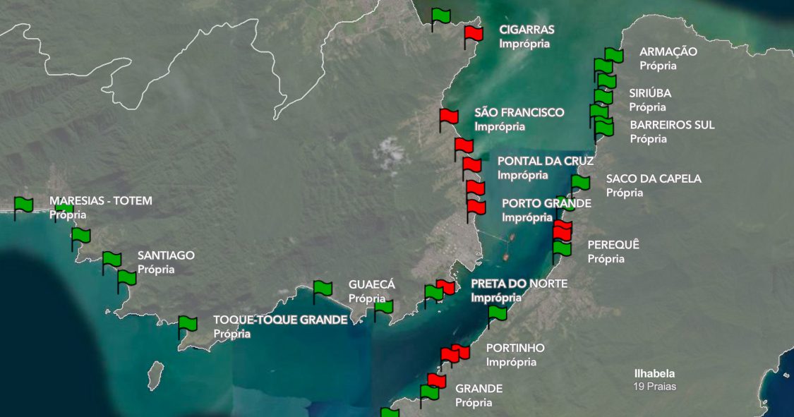 •   Em São Sebastião estão impróprias as praias, Deserta, Porto Grande, Preta do Norte, Pontal da Cruz, Arrastão, São Francisco e Cigarras.